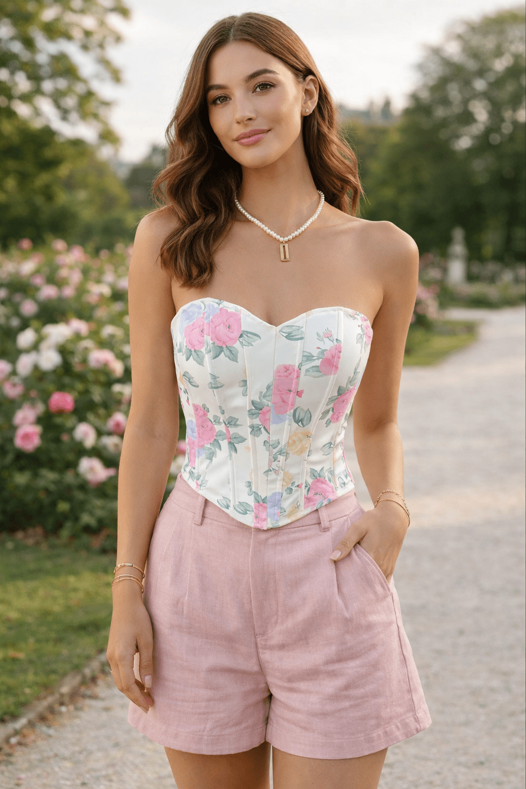 Ce bustier corset floral s’intègre facilement dans une garde-robe variée. En journée, il se porte avec un jean large bleu clair ou un short en lin pour un style léger et naturel, parfait pour les saisons chaudes.