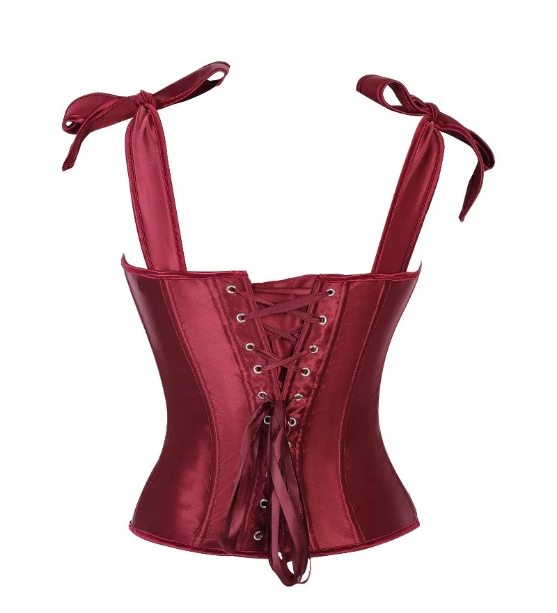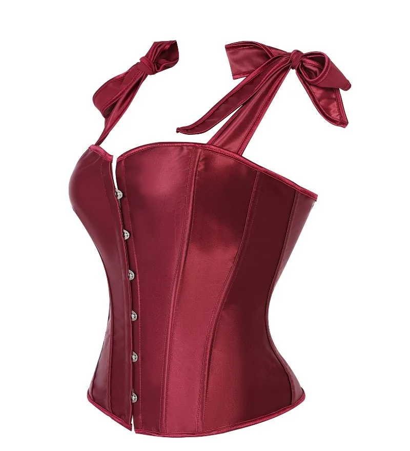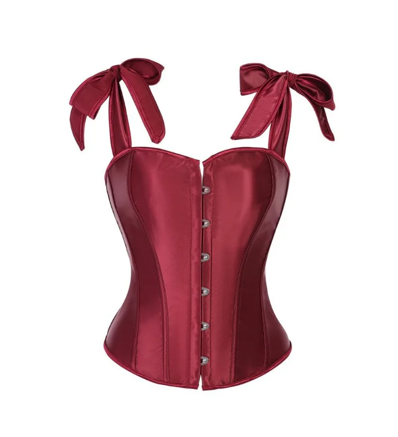 Ce corset se distingue par son tissu satiné à la brillance subtile qui capte la lumière et met en valeur la tenue. Sa teinte bordeaux profonde, proche du rouge vin, apporte une dimension élégante et intense idéale pour un look sophistiqué.