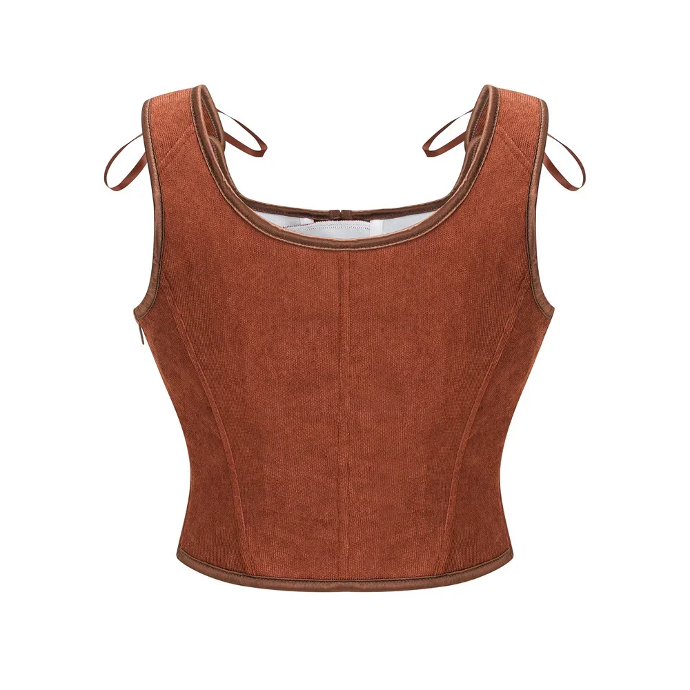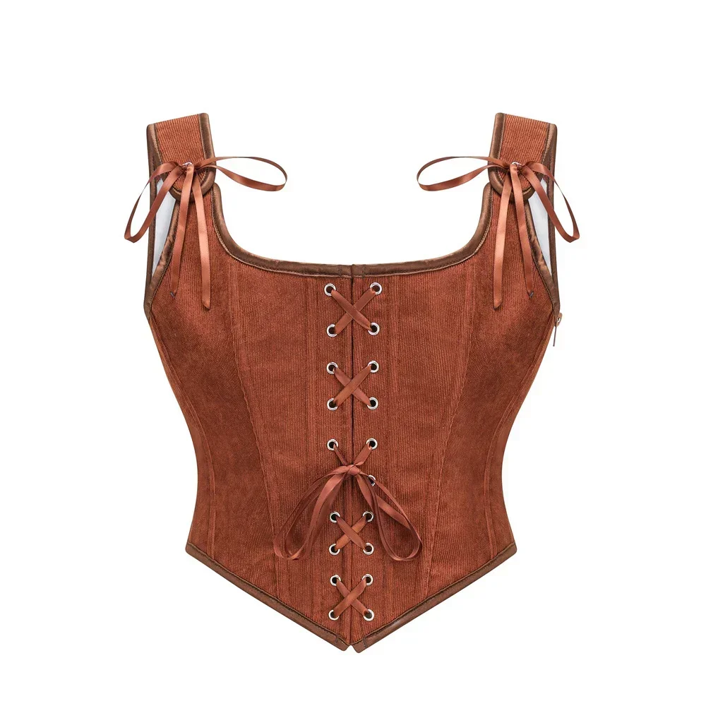 Bustier corset marron style velours, une pièce au caractère affirmé qui réchauffe la silhouette avec élégance.