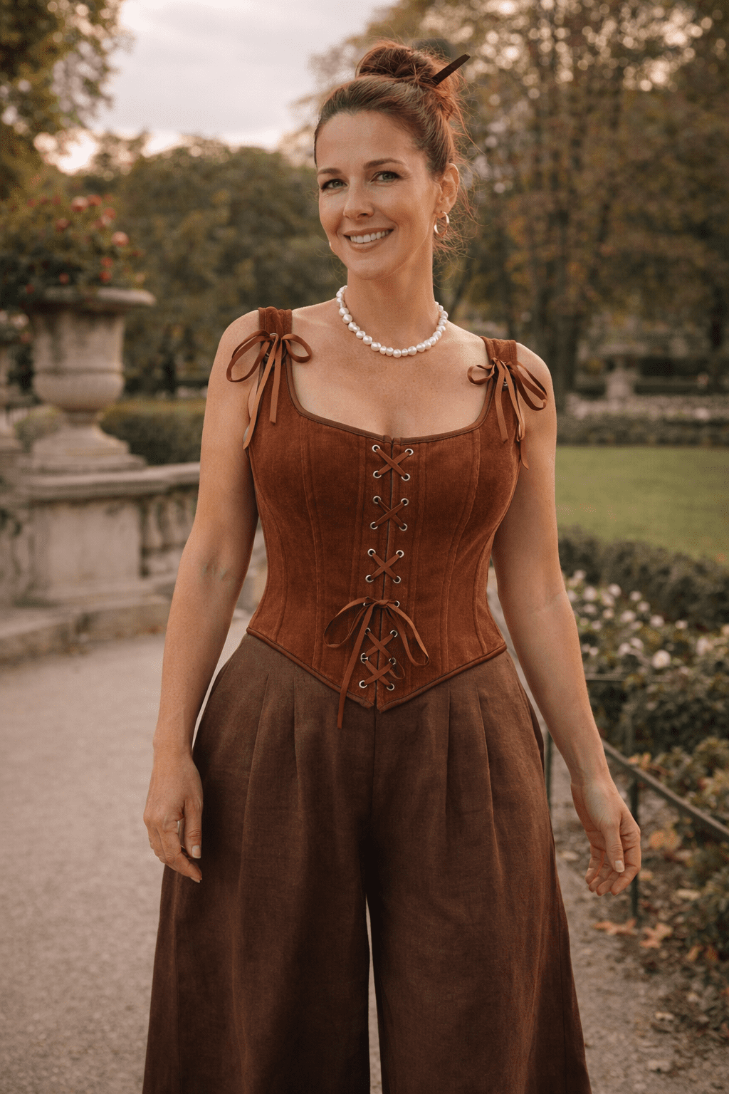bustier corset marron velours femme pantalon large chocolat jardin du Luxembourg Paris lumière douce