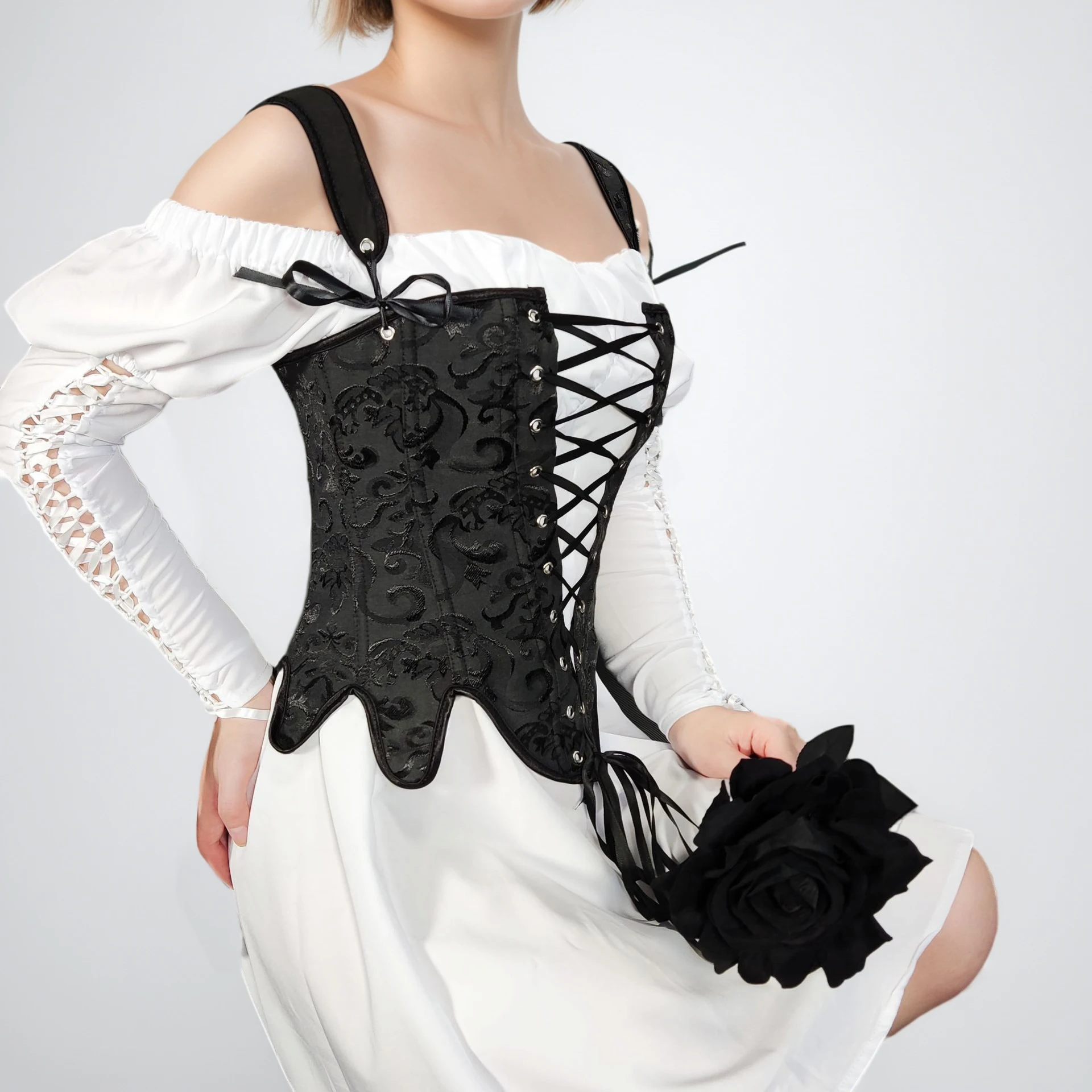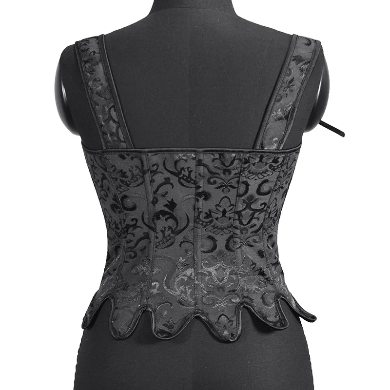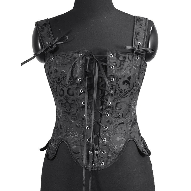 Le brocart floral ton sur ton enrichit visuellement le corset sans alourdir l’ensemble. Ce jeu de texture permet de créer un look à la fois chic, discret et travaillé, facile à intégrer dans différentes tenues.