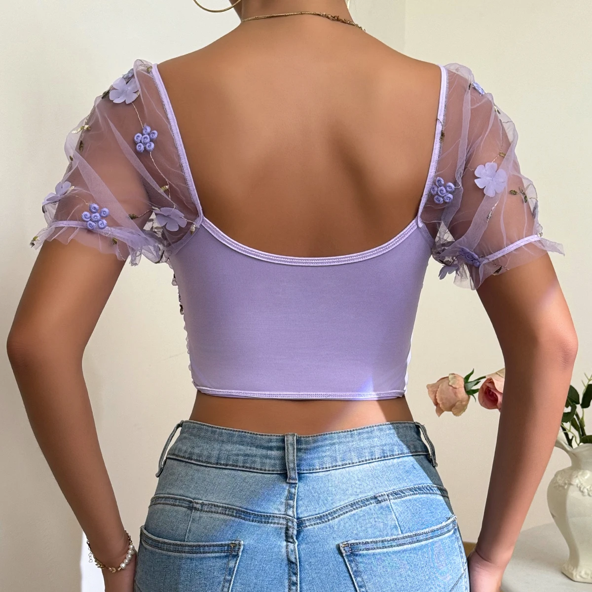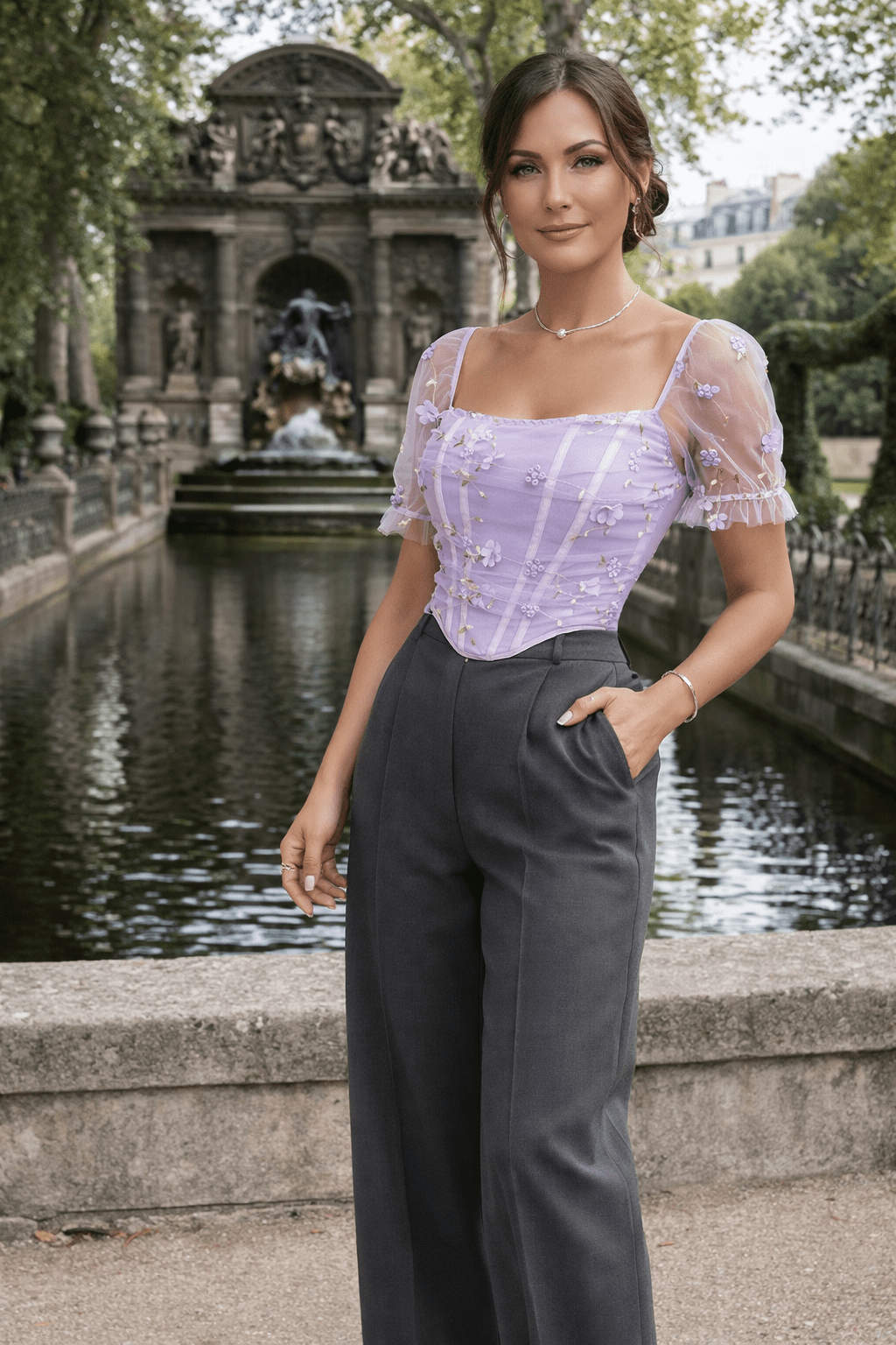Le bustier lavande fleuri séduit par son esthétique douce et raffinée, idéale pour composer une tenue élégante et féminine. Sa teinte lavande pastel associée à une broderie florale en relief apporte une dimension visuelle délicate et tendance. Les manches courtes en mesh transparent ajoutent une touche aérienne qui équilibre parfaitement la structure du bustier, pour un rendu à la fois romantique et contemporain.