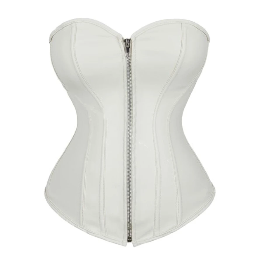 Ce corset blanc en similicuir se distingue par son design épuré et sa structure précise. Il s’intègre facilement dans une tenue élégante avec une jupe longue, ou dans un style plus moderne avec un pantalon taille haute.