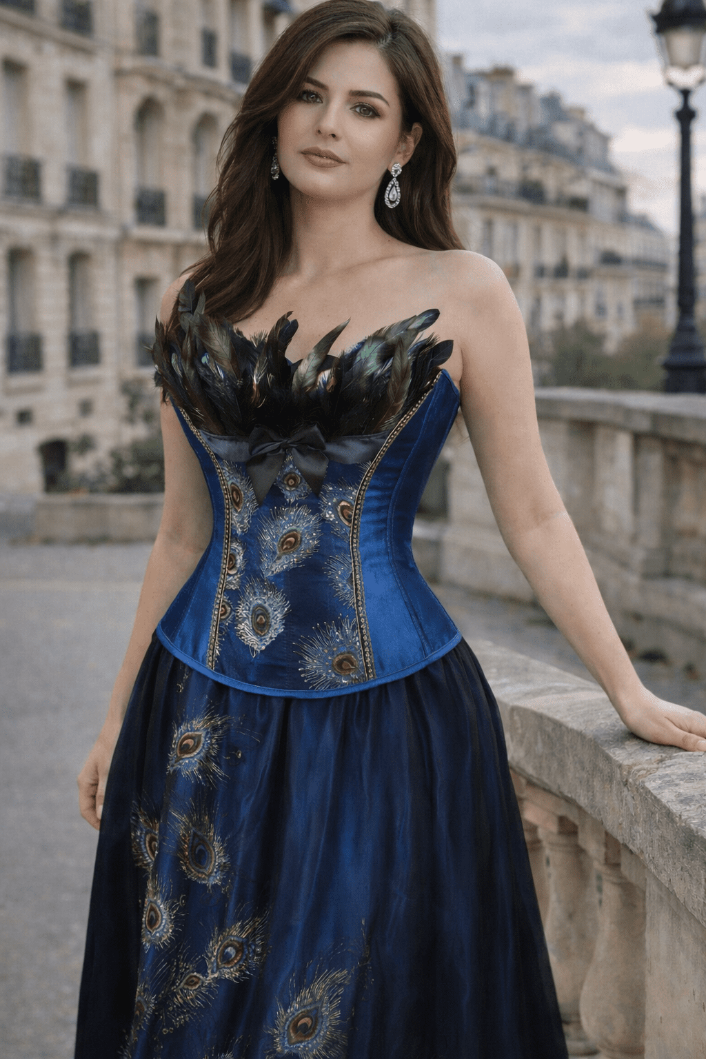 Ce corset se distingue par son tissu satiné bleu roi qui capte la lumière et met en valeur la tenue avec intensité. Les motifs inspirés des plumes de paon créent un jeu visuel riche, renforcé par la présence de plumes noires qui apportent du volume et du relief.