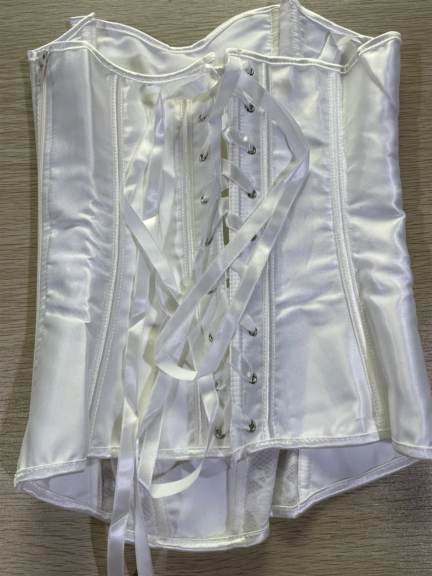 Ce corset blanc satiné séduit par son rendu lumineux et ses finitions soignées. Le tissu satin capte la lumière avec subtilité, apportant une touche douce et élégante à votre tenue.