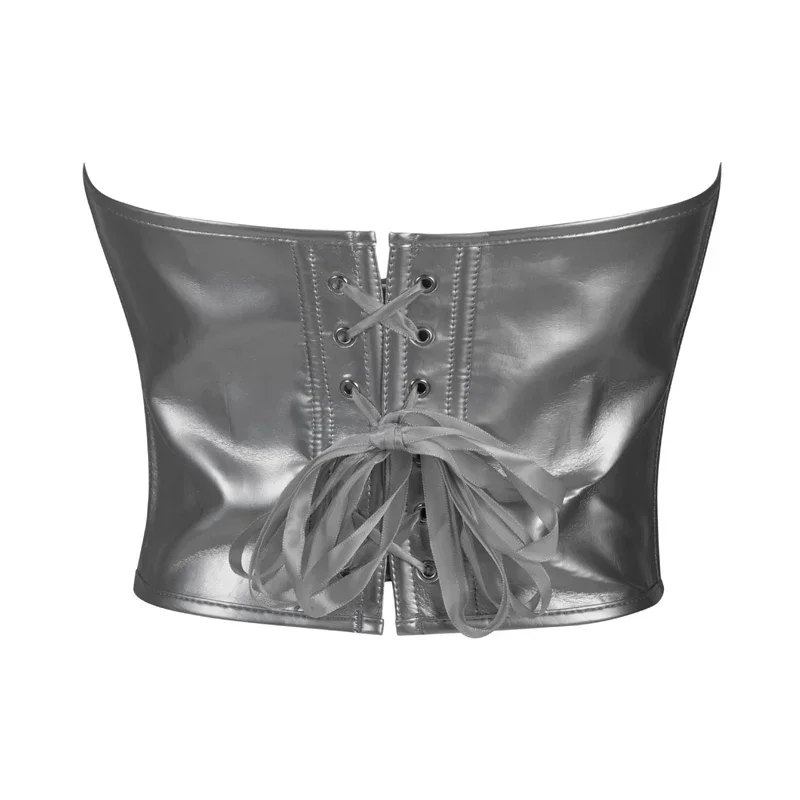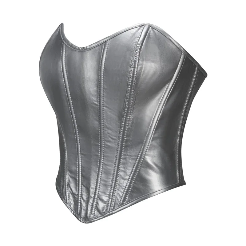 Corset bustier gothique gris métallisé : une pièce au reflet intense qui affirme un style sombre et contemporain.