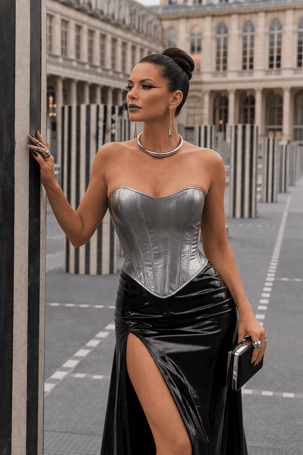 corset bustier gothique gris metallise femme 45 ans palais royal colonnes buren paris jupe pvc noire fente haute look moderne
