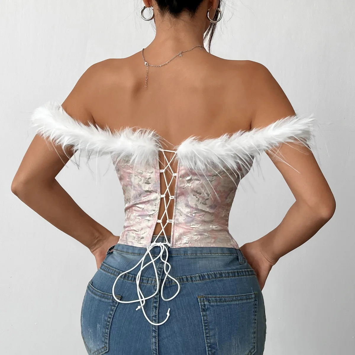 Ce corset est un incontournable pour celles qui recherchent une silhouette flatteuse et une allure rétro-chic incomparable. Autour du décolleté, de douces plumes blanches forment une ligne ondulée qui encadre les épaules et retombe légèrement sur les bras, apportant un effet théâtral voluptueux.