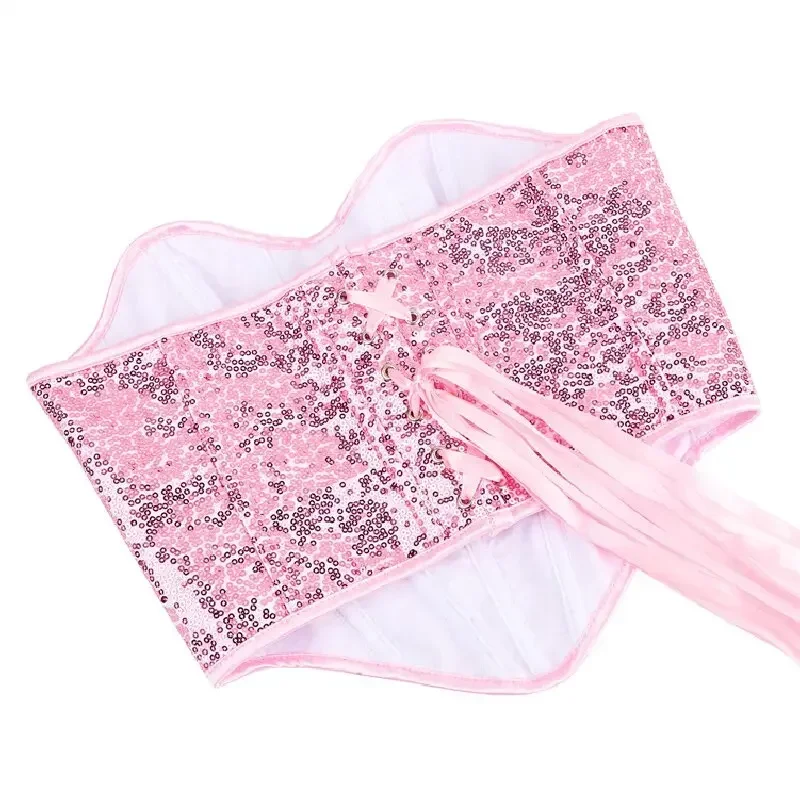 Le corset bustier rose à sequins attire immédiatement le regard grâce à ses finitions scintillantes et son allure résolument féminine. Sa découpe en pointe au bas du corset allonge visuellement le buste, tandis que son décolleté en cœur très prononcé met en valeur la poitrine avec élégance.