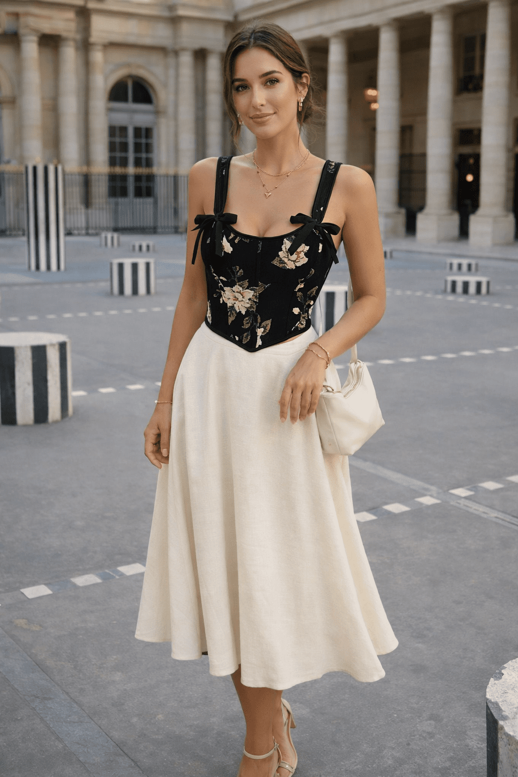 Polyvalent, ce corset fleuri noir s’adapte facilement à différentes tenues. Porté avec une jupe midi en lin crème, il crée un look parisien chic et lumineux. Associé à un jean taille haute ou un pantalon fluide, il apporte immédiatement une touche élégante.
