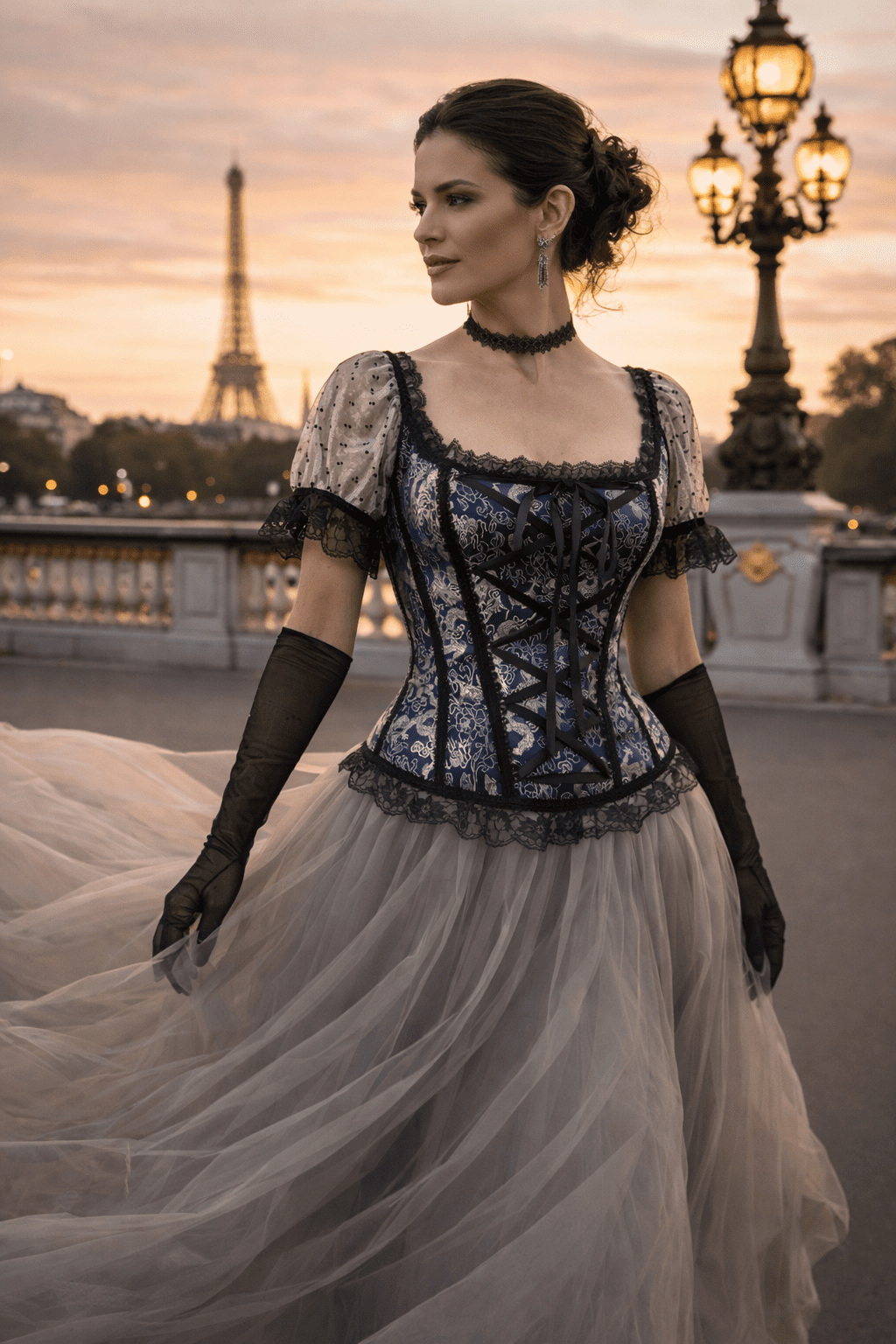 corset gothique romantique brocart bleu et argent avec manches bouffantes et dentelle porté sur le pont Alexandre III à Paris