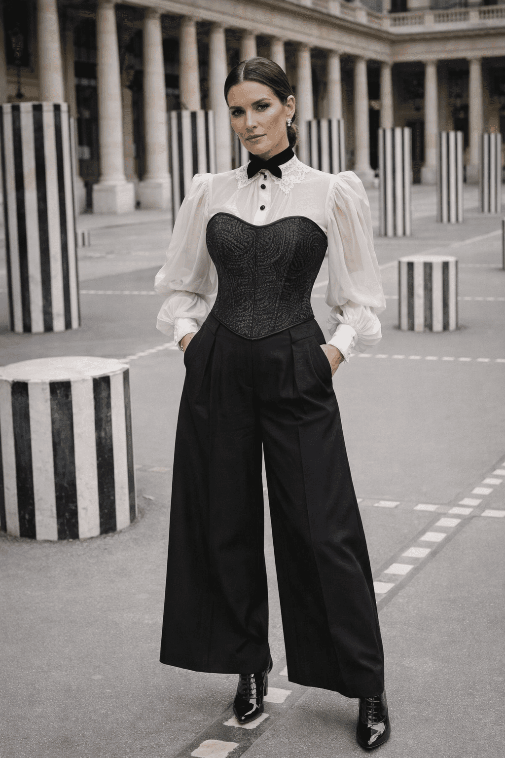 corset gothique noir motif celtique porté avec chemise blanche mousseline manches bouffantes et pantalon tailleur large noir sous les arcades du palais royal paris