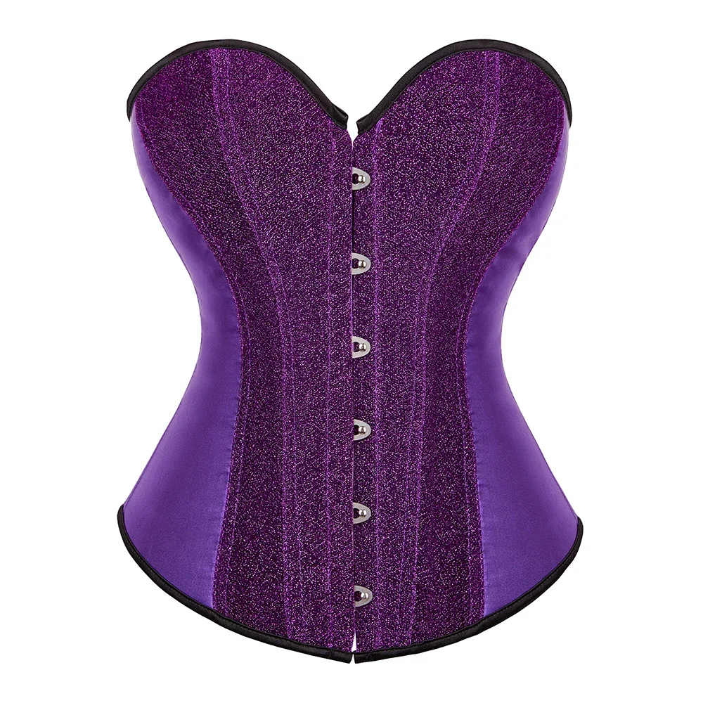 Le corset gothique violet à paillettes se porte aussi bien en journée sur un tee-shirt minimaliste qu’en soirée avec une tenue plus sophistiquée. Il s’associe parfaitement à un pantalon tailleur ou une jupe en satin pour un rendu chic et moderne.