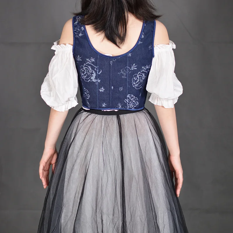 Le corset jean bleu fleuri vintage se distingue par son esthétique inspirée des silhouettes rétro revisitées. Son bleu cobalt profond associé à un motif floral délicat crée un contraste élégant qui attire immédiatement le regard.