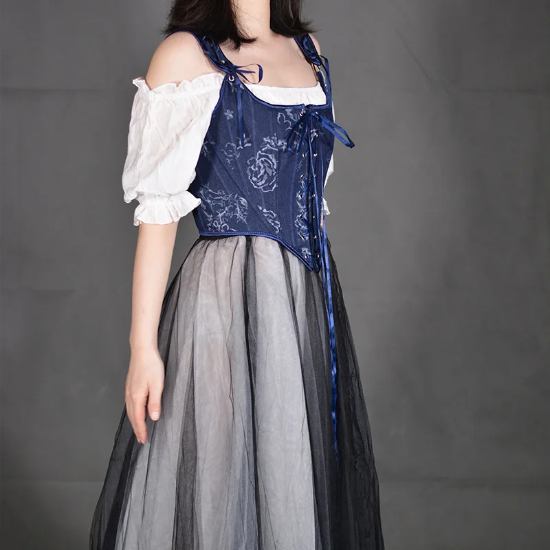 Ce corset bleu fleuri s’intègre facilement dans différents styles. En journée, il se porte sur une robe légère en lin ou un chemisier blanc pour une allure cottagecore élégante. En soirée, porté seul avec une jupe satinée ou un jean foncé, il crée un look plus affirmé et sophistiqué.