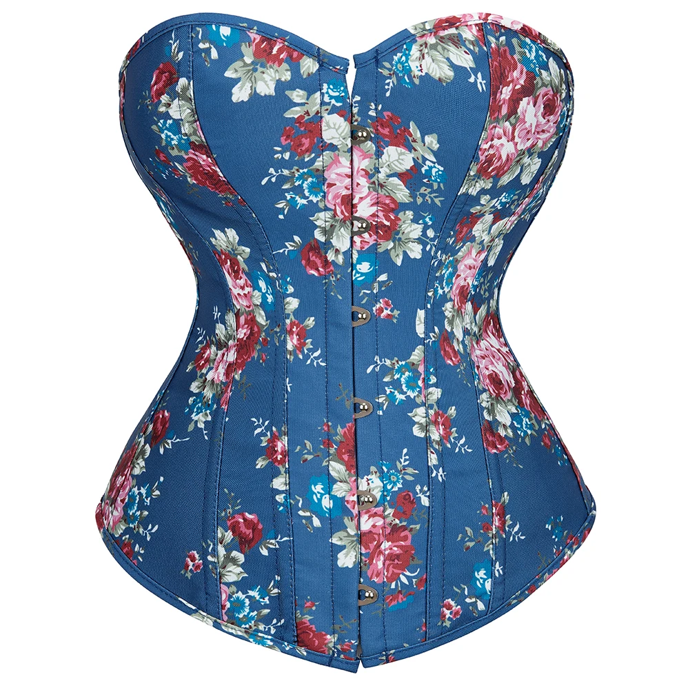 Corset bleu style jean imprimé floral vintage grande taille : charme rétro et silhouette structurée