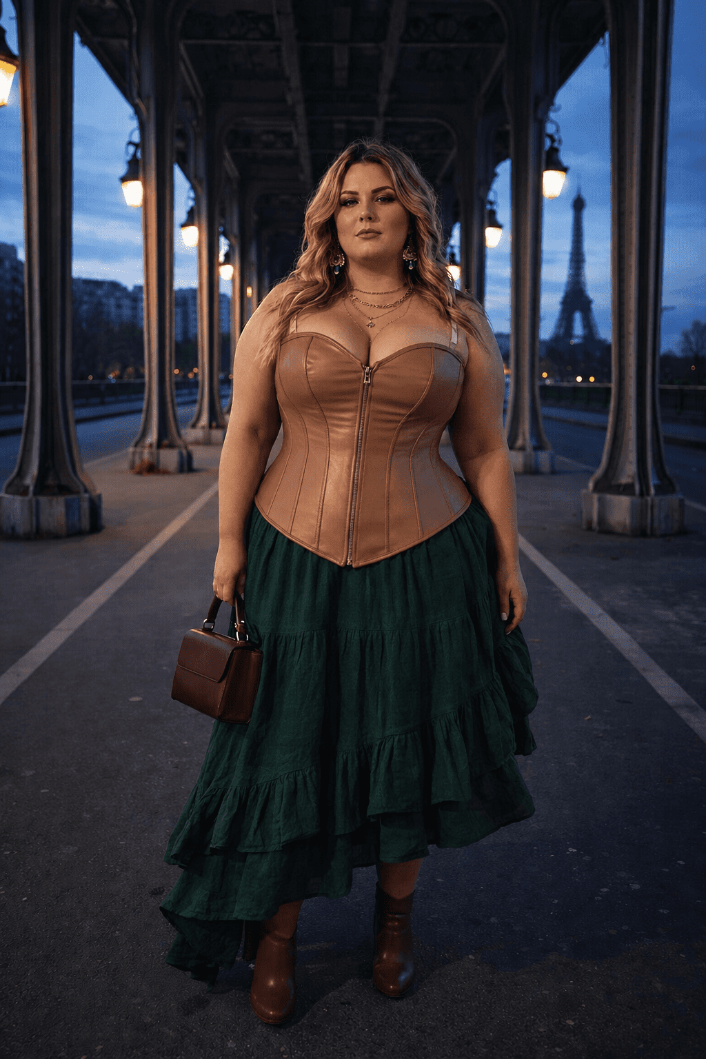 Corset similicuir marron tabac porté par femme taille XXL au Pont Bir-Hakeim à Paris, jupe verte à volants, style steampunk chic à l’heure bleue
