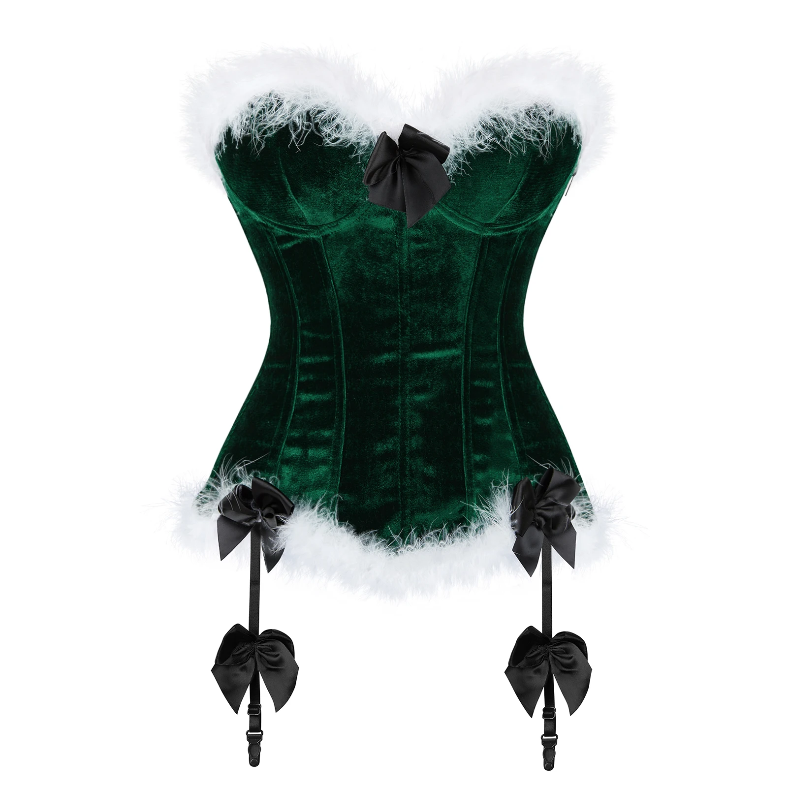 Corset mère Noël vert porte-jarretelles grande taille XL à 5XL en velours vert avec maintien structuré, laçage au dos et style festif élégant.