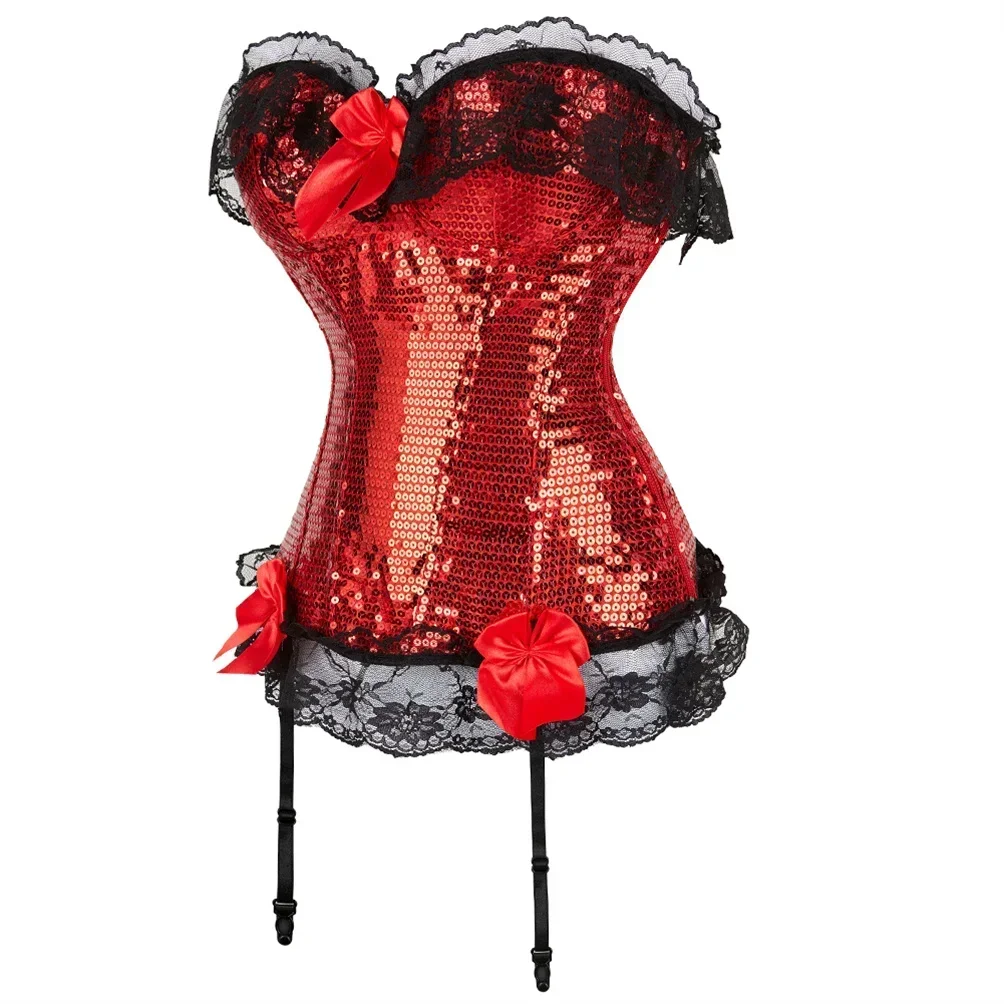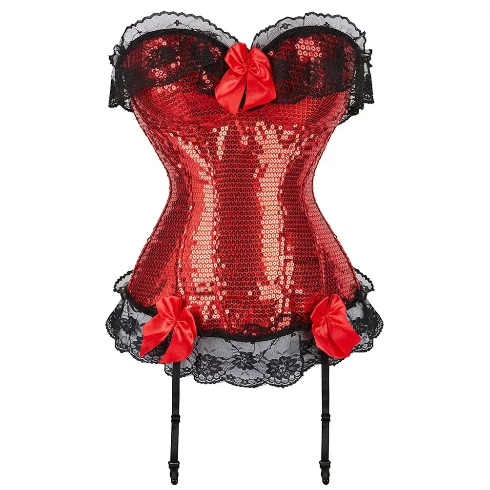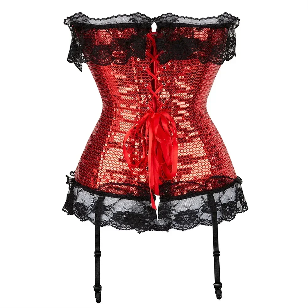 Corset rouge paillettes et dentelle noire au design scintillant et à l’allure glamour inspirée des années disco