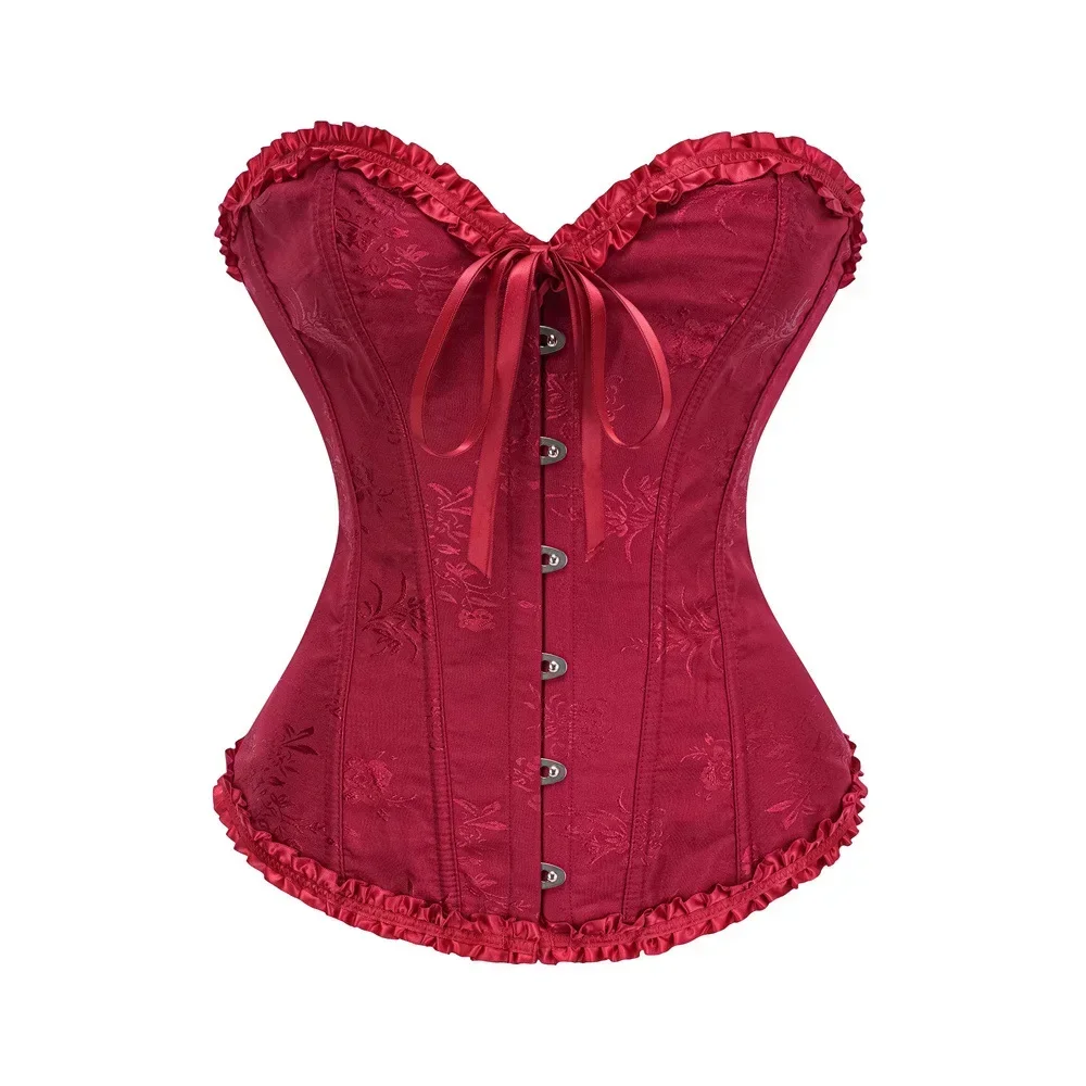 Le corset rouge vin se distingue par ses bordures festonnées qui soulignent les lignes avec élégance. Le nœud décoratif à l’entre-sein apporte une touche romantique supplémentaire.
