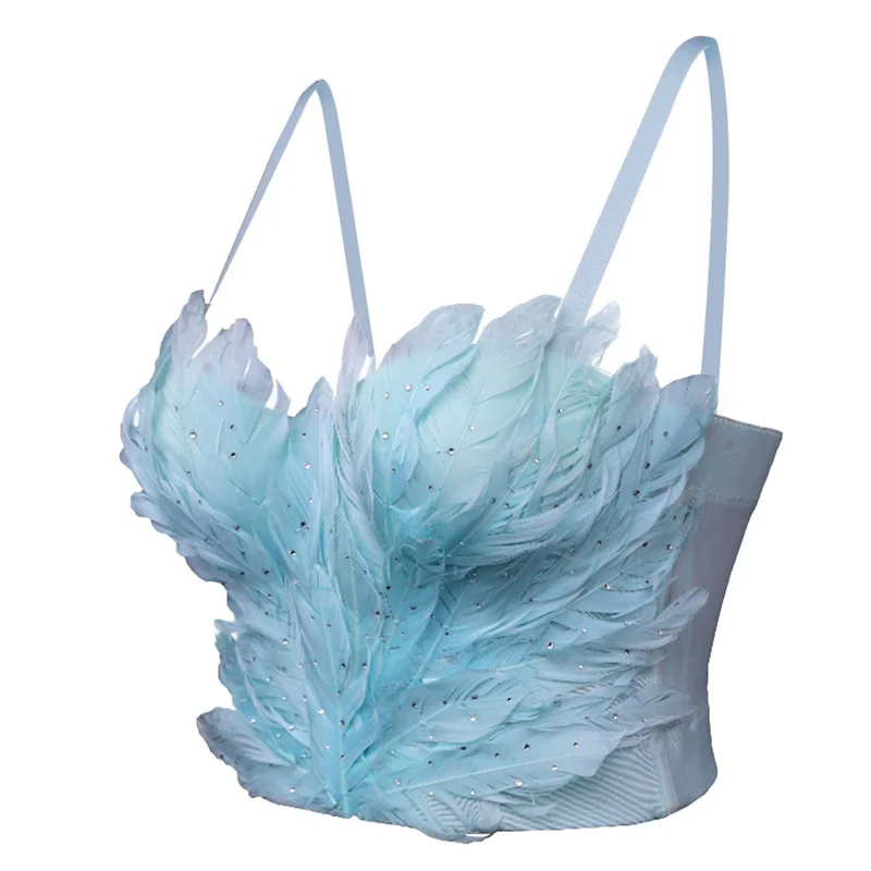 Ce corset soutien-gorge bleu ciel séduit par son allure délicate et son effet visuel léger grâce à ses plumes naturelles en cascade qui apportent du mouvement et une dimension unique à la tenue. Son design travaillé met en valeur la silhouette tout en créant un rendu élégant et moderne, parfaitement adapté aux tendances actuelles.