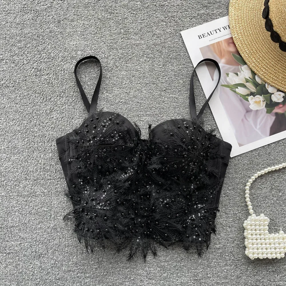Les détails de ce corset noir à plumes et perles renforcent son allure chic et contemporaine. Le design en dentelle orné de plumes et de perles noires crée un contraste subtil entre texture et brillance. Ce mélange de matières donne au modèle un style glamour et moderne.