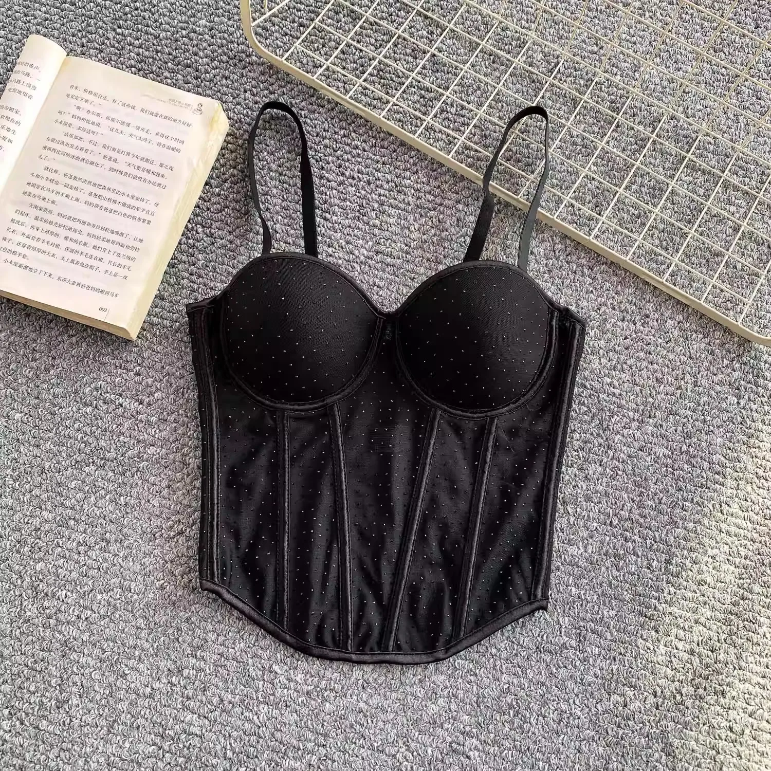 Le corset soutien-gorge noir brillant est une pièce de lingerie sophistiquée qui attire immédiatement le regard grâce à ses détails scintillants délicats. Son tissu noir profond orné de strass capte subtilement la lumière et crée un effet élégant et glamour. Ce corset femme noir met naturellement le buste en valeur tout en apportant une allure moderne et séduisante.