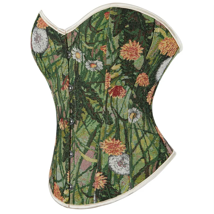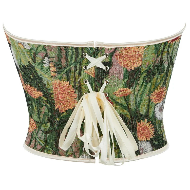 Ce corset se distingue par son imprimé floral inspiré des peintures à l’huile, apportant une dimension artistique et raffinée à la tenue. Les nuances de vert associées aux motifs multicolores créent un ensemble harmonieux et lumineux.