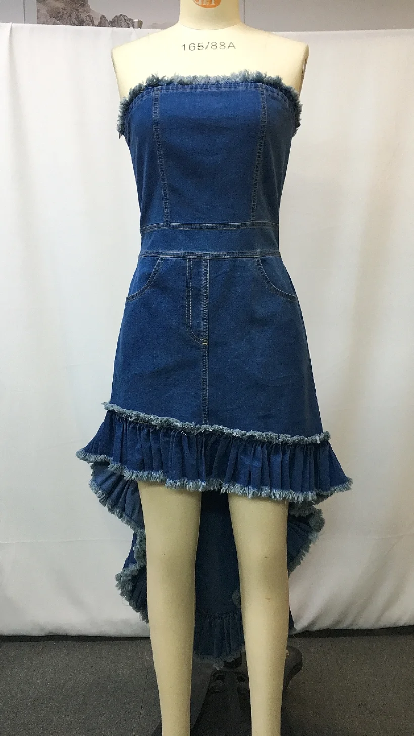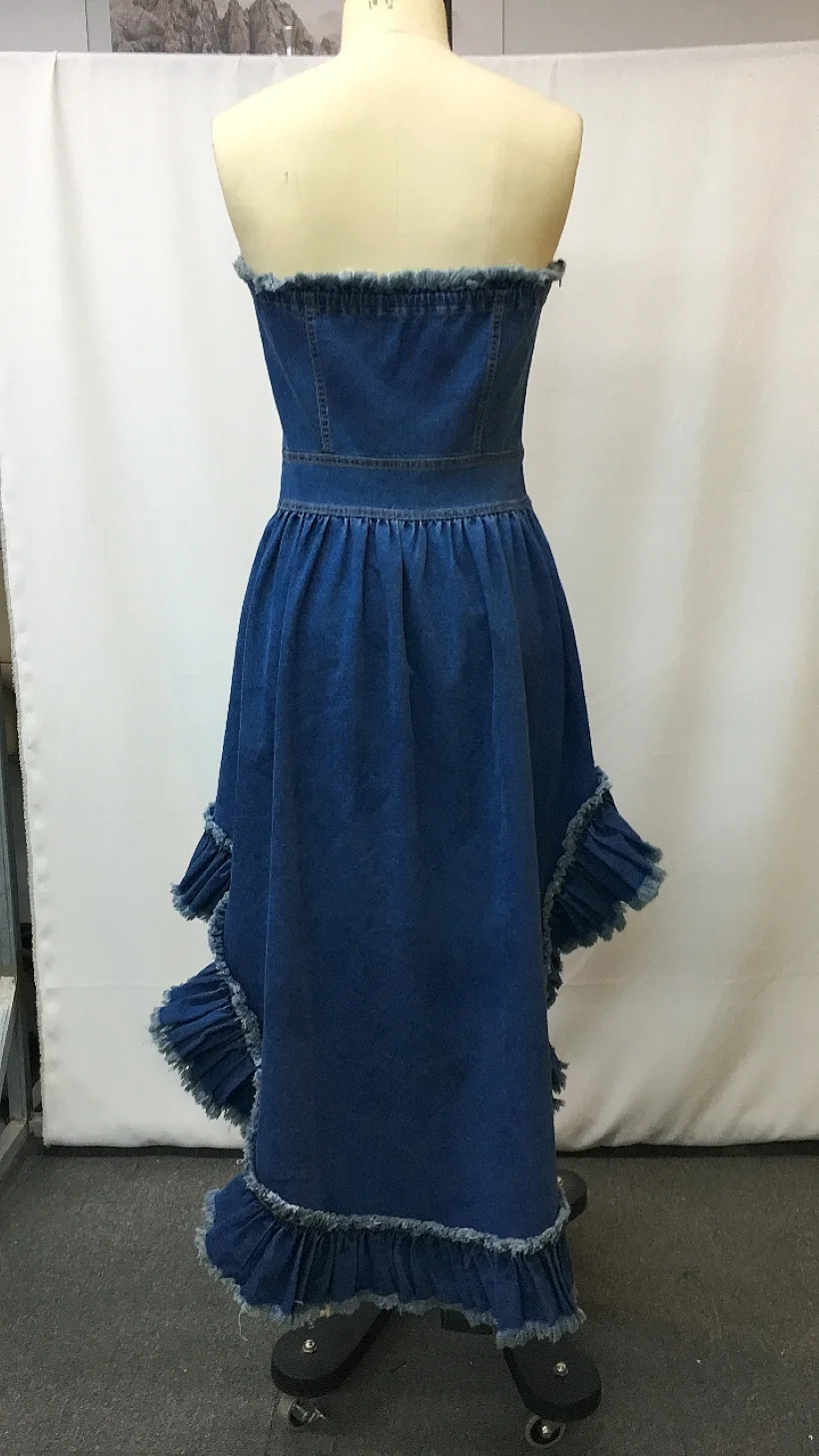 Robe bustier longue en jean bleu bohème, une robe élégante et décontractée qui met la silhouette en valeur grâce à sa coupe ajustée et son style bohème chic idéal pour un look moderne et féminin.