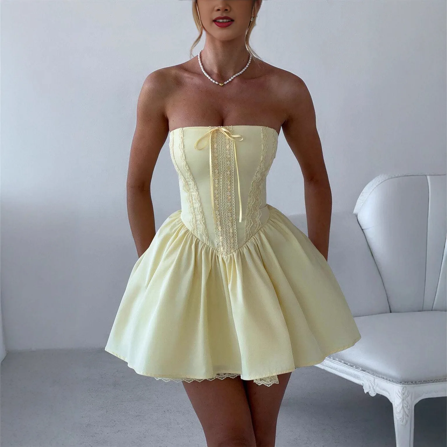 Inspirée du charme parisien et du style ballerine, cette robe bustier corset femme associe romantisme et modernité. Sa teinte jaune pastel illumine naturellement la silhouette et apporte une touche fraîche et raffinée.
