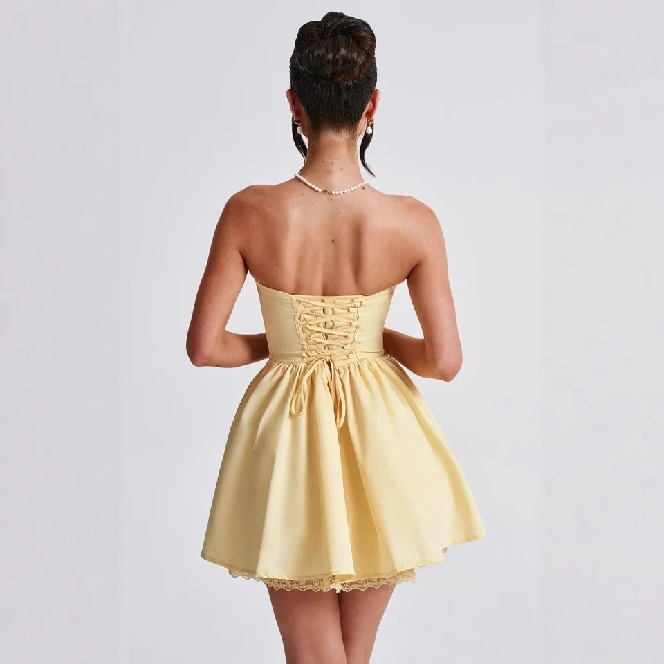 Polyvalente et séduisante, cette robe corset courte jaune pastel s’adapte parfaitement aux occasions spéciales comme une soirée d’été, un cocktail, une fête ou un événement élégant.