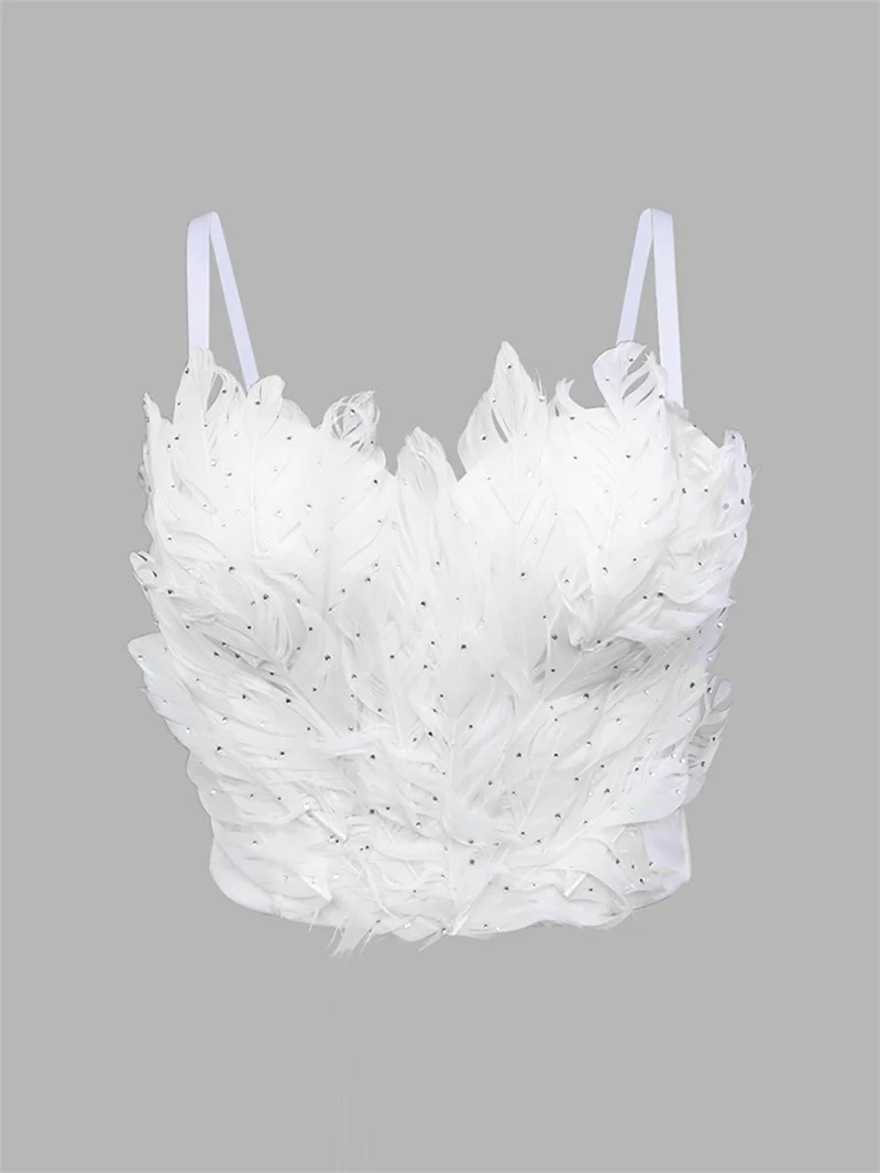 Ce soutien-gorge corset se distingue par un visuel unique où les plumes naturelles en cascade créent un effet aérien et sophistiqué. Les strass scintillants viennent sublimer l’ensemble en apportant une touche lumineuse idéale pour attirer le regard avec subtilité.