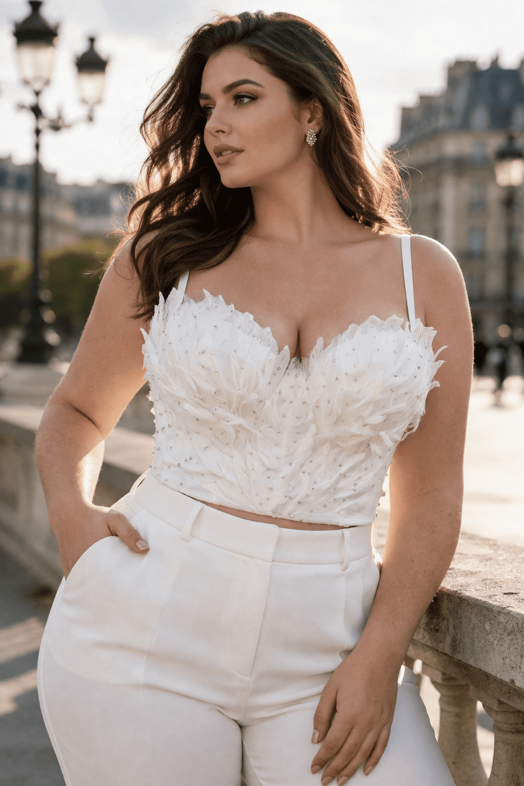 Ce corset à plumes blanches s’intègre facilement dans de nombreuses tenues, que ce soit pour une soirée élégante ou un look plus audacieux. Il peut être porté seul ou avec une veste pour un rendu structuré et moderne.