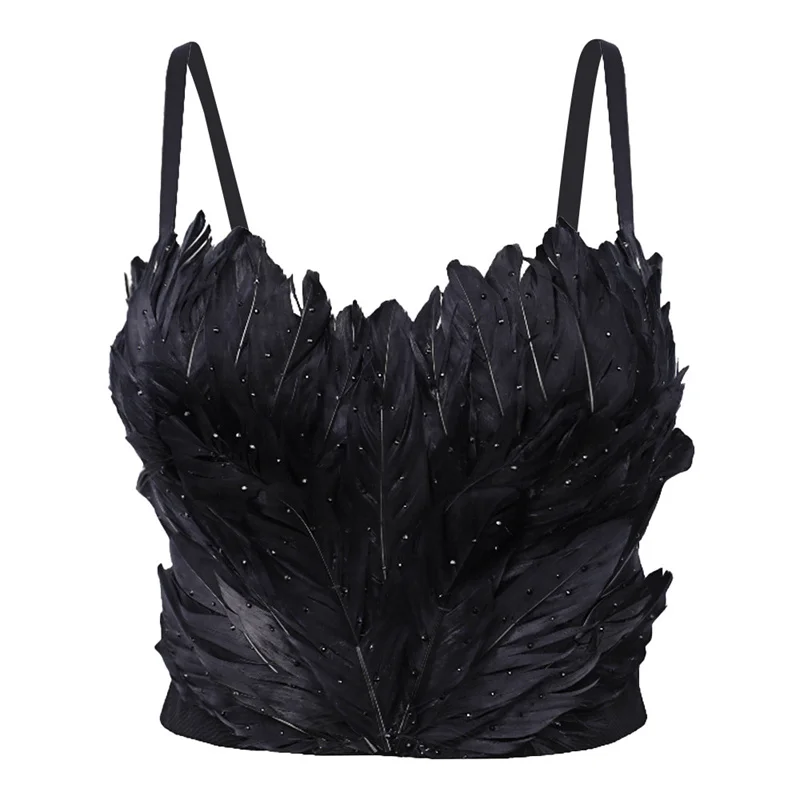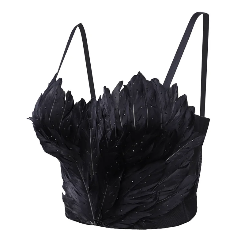 Ce soutien-gorge corset noir séduit par son allure profonde et sophistiquée. Les plumes naturelles en cascade apportent du mouvement et créent un effet visuel unique, tandis que les strass scintillants ajoutent une touche lumineuse subtile.