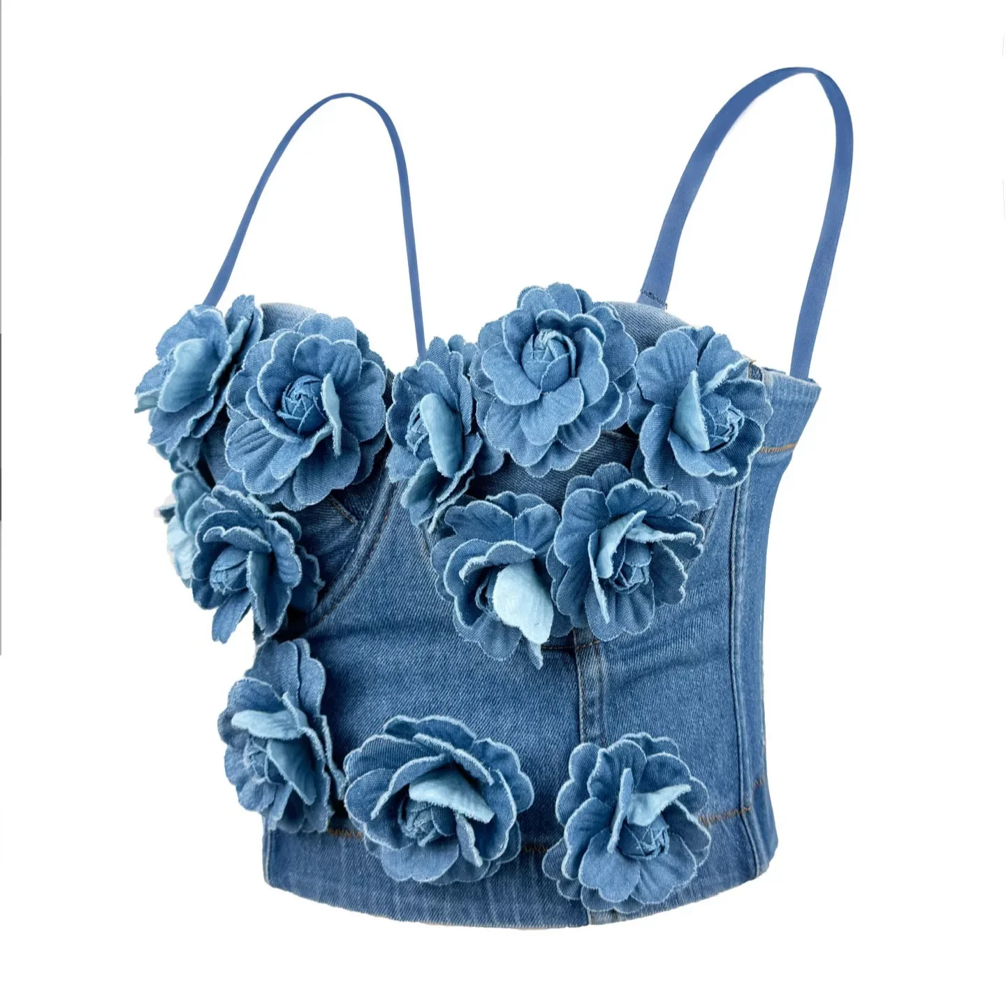 Ce soutien-gorge corset en jean bleu fleuri associe l’originalité d’un effet jean moderne à la délicatesse de motifs floraux élégants. Son design audacieux apporte une touche de fraîcheur et de féminité tout en mettant en valeur la silhouette avec une coupe inspirée de la corseterie.