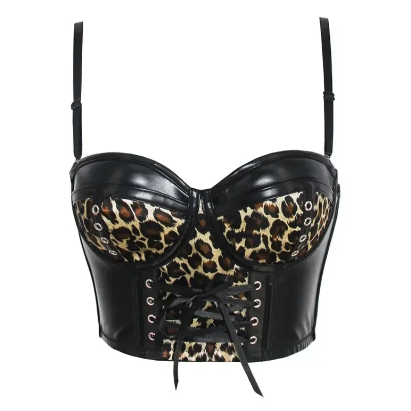 Le soutien-gorge corset gothique noir léopard se distingue par son contraste visuel unique entre le noir profond et le motif animalier. Cette combinaison crée une allure forte et moderne, idéale pour celles qui souhaitent affirmer leur style avec élégance.
